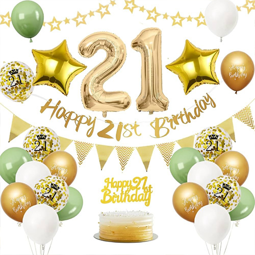 Set balon ke-21: Set balon ke-21 ini terdiri dari balon lateks, balon foil, bendera ulang tahun, dan aksesori lainnya. Mudah untuk dirakit dan dapat membuat pesta ulang tahun ke-21 Anda lebih seremonial. Pengaturan berkualitas tinggi dan menakjubkan akan membantu Anda mencerahkan malam ulang tahun Anda yang ke-21 dan menjadikan ini momen berharga yang tidak akan pernah dilupakan oleh putri Anda, Anda sendiri, dan seluruh keluarga.