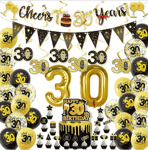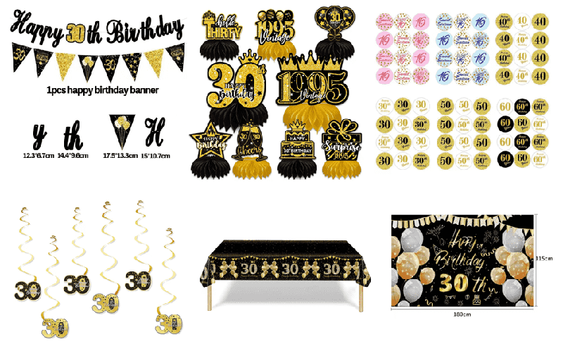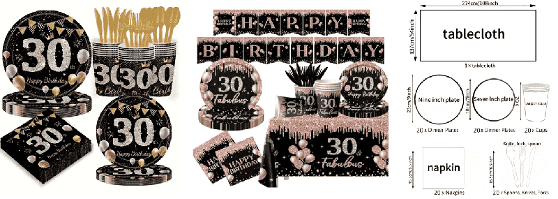 Kartu ulang tahun kertas adalah inti dari dekorasi kue: kartu utama didasarkan pada kata-kata seperti "Selamat ULANG TAHUN ke-30" dan disesuaikan dengan bentuk cangkir sampanye. Ukurannya besar dan cocok untuk dekorasi kue utama. Terdapat juga logo lingkaran "30", bintang, mahkota dan kartu kecil lainnya, cocok untuk cupcakes, terbuat dari karton keras yang menebal, dengan batang bambu di bagian bawah, dapat dimasukkan untuk digunakan.