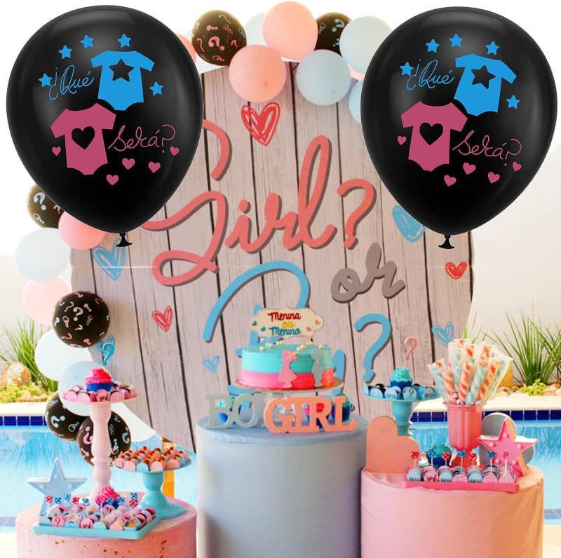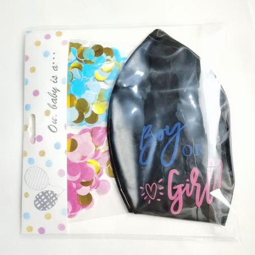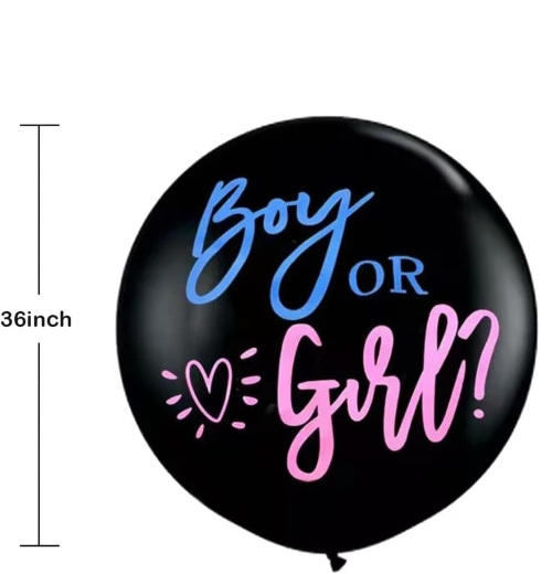 UntukBalon pengungkapan gender 36 inciStoknya berwarna hitam matte dan memiliki banyak model pencetakan, seperti gambar karakter laki-laki atau perempuan, gambar karakter laki-laki dan perempuan atau hal lain yang berhubungan dengan laki-laki dan perempuan. Untuk confetti, satu tas berisi confetti kertas merah muda dengan confetti warna emas foil, tas lainnya berisi confetti kertas biru dengan confetti warna emas foil.