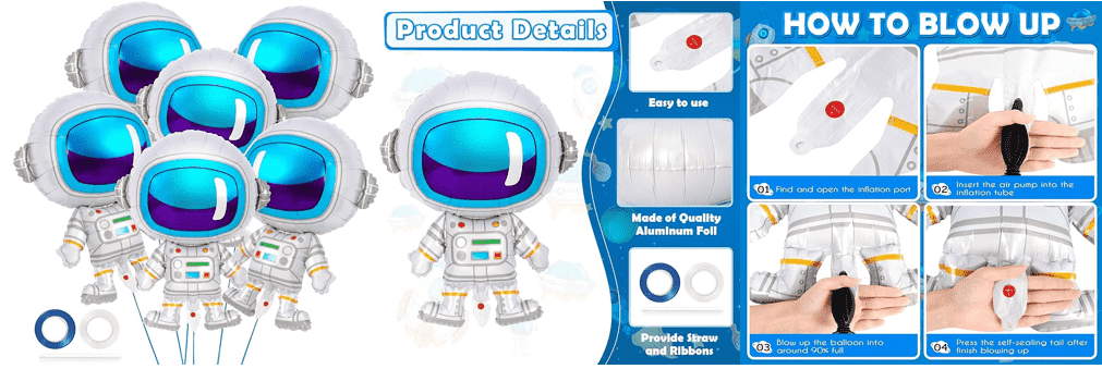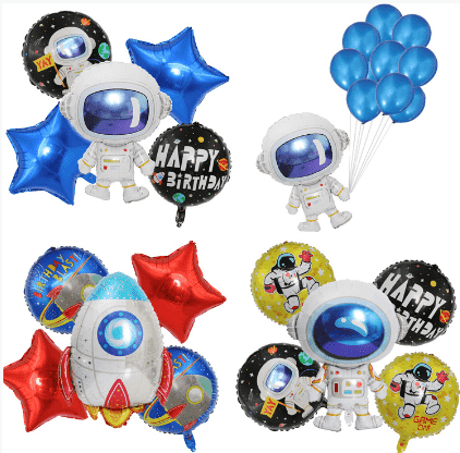 Ada bentuk tubuh penuh astronot yang umum, menampilkan gambar astronot yang mengenakan pakaian luar angkasa, beberapa gaya dengan alas, kaleng tiup berdiri. Tersedia berbagai ukuran, seperti 18 inci, 24 inci, 28 inci, dll, serta beberapa balon yang lebih besar, seperti balon foil astronot berdiri dengan tinggi 65cm. Hal ini terutama digunakan untuk pesta ulang tahun bertema luar angkasa, pesta penyambutan bayi, dekorasi kamar anak-anak, dan acara lainnya, yang dapat menambah suasana ruang yang menyenangkan pada acara tersebut.
