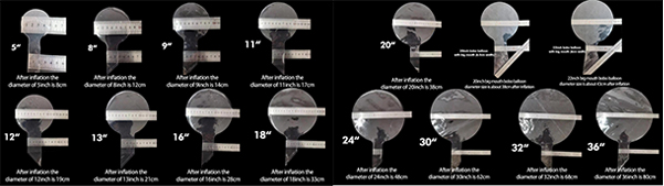 Balon Bobo transparan tersedia dalam berbagai ukuran, tercantum di sini. Ukuran yang berbeda sesuai dengan model yang berbeda dan dimensi yang meningkat secara keseluruhan. Anda dapat menyesuaikan ukuran Anda sesuai.