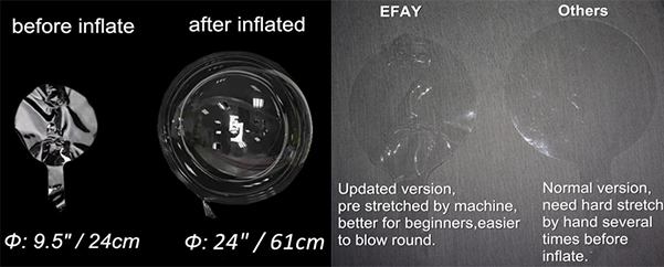 Balon gelembung bermulut lebar ini membutuhkan upaya yang cukup besar untuk meregangkan tangan. Niun Brand secara khusus meregangkan balon dengan mesin sebelum pengiriman, menghemat waktu dan upaya Anda saat menggembungkan. Untuk hasil yang lebih baik dan bentuk balon yang lebih bulat, kami sarankan menggunakan pompa udara listrik.