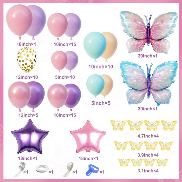 Kit karangan bunga balon kupu-kupu terutama mencakup balon lateks, tersedia dalam berbagai ukuran (5 inci, 10 inci, 12 inci, dan 18 inci). Warnanya biasanya didominasi oleh warna pink, biru, ungu, dll. Untuk meningkatkan efek pelapisan pada kit, Anda juga dapat melihat balon lateks transparan dan balon lateks confetti. Sebagai tema kit, balon foil kupu-kupu juga sangat diperlukan. Mayoritas warnanya cerah (biru/merah muda/ungu...), dan ukuran rata-rata adalah 18-30 inci (dengan tersedia ukuran khusus). Selain itu, mereka memiliki tampilan yang sangat realistis hingga hampir seperti aslinya.