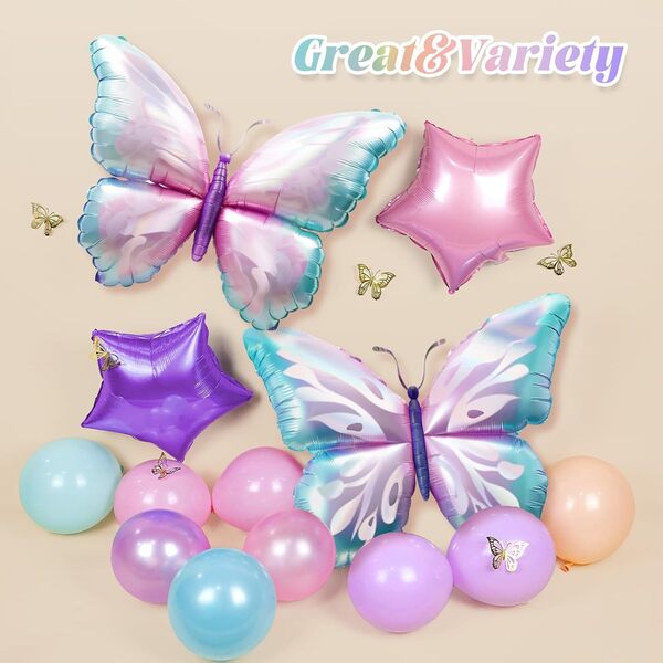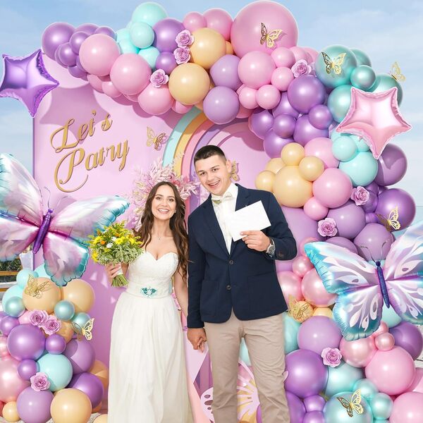 Kit lengkungan balon kupu-kupu: Kit lengkungan berwarna-warni dan menarik perhatian, terdiri dari berbagai balon foil dan balon lateks. Saat menyusunnya, tambahkan papan latar belakang dengan pola dan teks berbeda, lalu kelilingi balon di sekitarnya. Ialah pencipta suasana pada acara tersebut. Berfoto di depannya akan terlihat sangat indah.