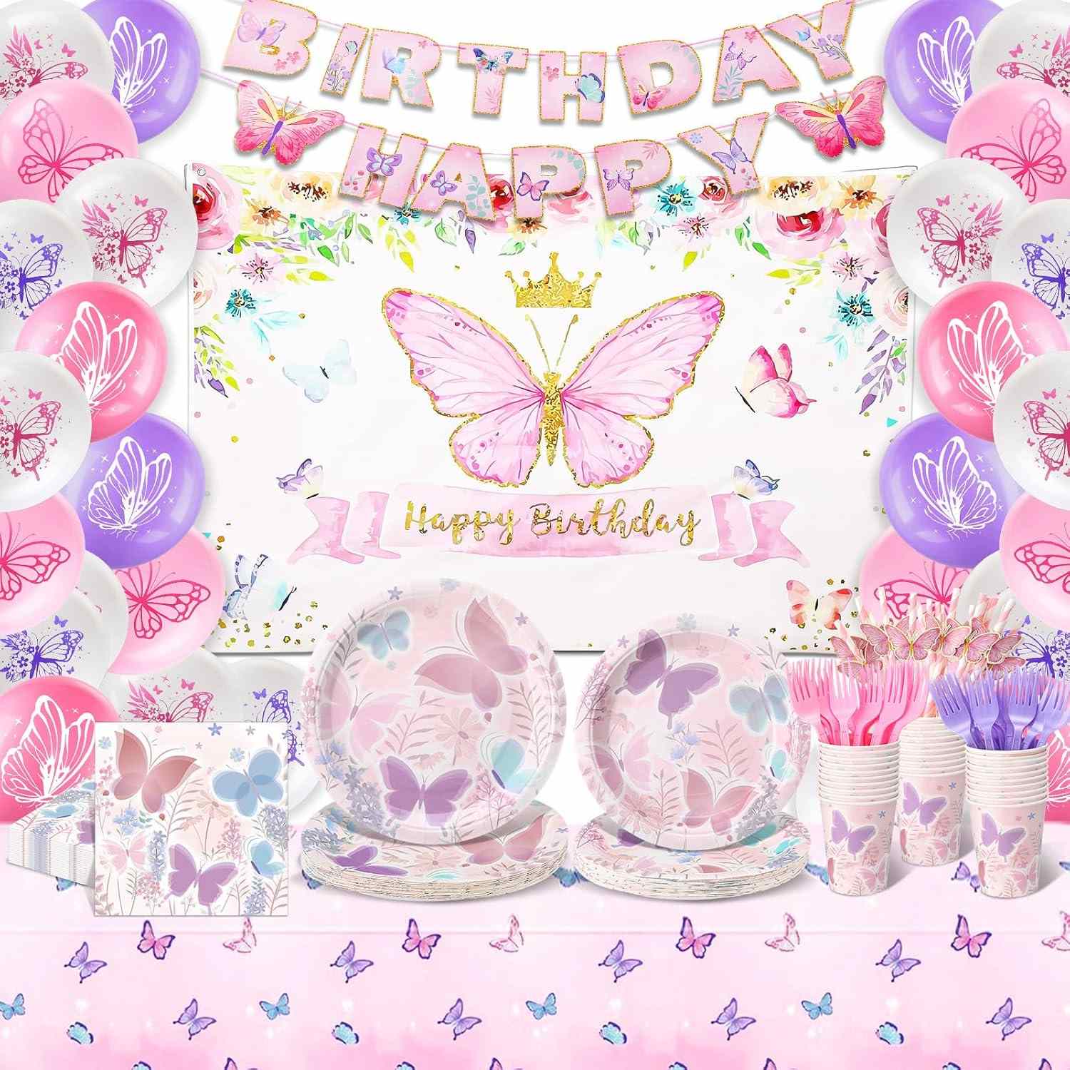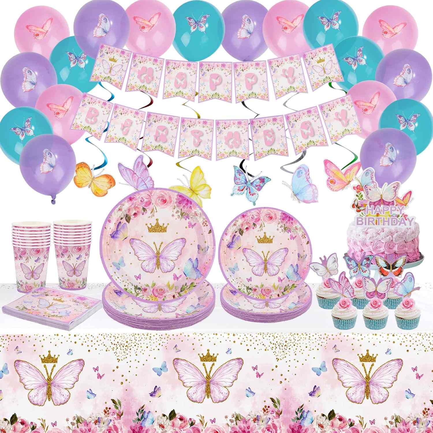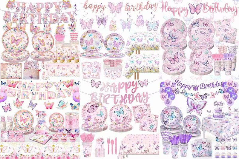 Pilihan terbaik untuk dekorasi pesta adalah set peralatan makan pesta kupu-kupu. Termasuk serbet, piring kertas, gelas kertas, garpu, dan pisau. Setiap bagian menunjukkan bagian kupu-kupu.