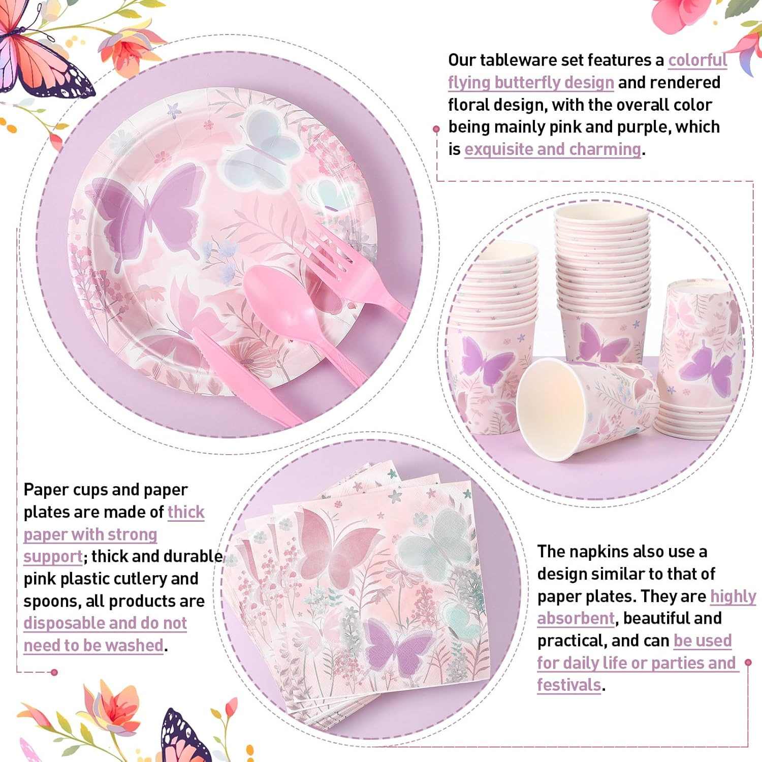 Solusi khusus itu fleksibel. Jumlah set peralatan makan dapat berubah sesuai dengan besarnya pesta. Gaya polanya juga bisa berubah. Itu dapat menampilkan berbagai tema atau tampilan kartun lucu. Teks dapat ditambahkan, seperti nama atau tanda pesta. Setiap set peralatan makan kupu-kupu terlihat istimewa dan menyimpan kenangan untuk pesta.