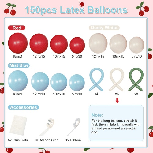 Balon lateks lengkungan balon bunga sakura terbuat dari 100% lateks mentah yang diimpor dari Asia Tenggara. Bahannya ramah lingkungan dan sama sekali tidak berbahaya bagi anak-anak dan orang dewasa. Ukurannya mulai dari 5 inci hingga 18 inci. Balon lateks merah 5 inci dan balon lateks panjang hijau digunakan untuk membuat gaya ceri kecil yang lucu.