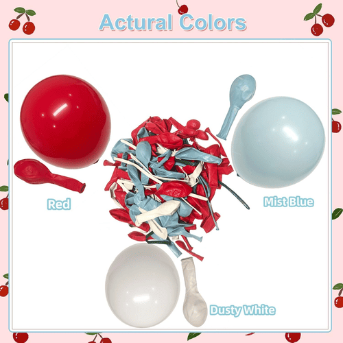 Lengkungan balon bunga sakura hadir dengan berbagai macam balon lateks, antara lain balon lateks bulat dan balon lateks panjang. Gaya total dari perlengkapan ini positif dan lucu, disukai oleh pelanggan di seluruh dunia. Warna balon lateks bulat adalah merah, putih berdebu, dan biru kabut. Dan untuk balon latex panjang berwarna biru kabut, putih berdebu dan hijau, balon latex panjang digunakan untuk membuat model dasi kupu-kupu dan gaya cherry.