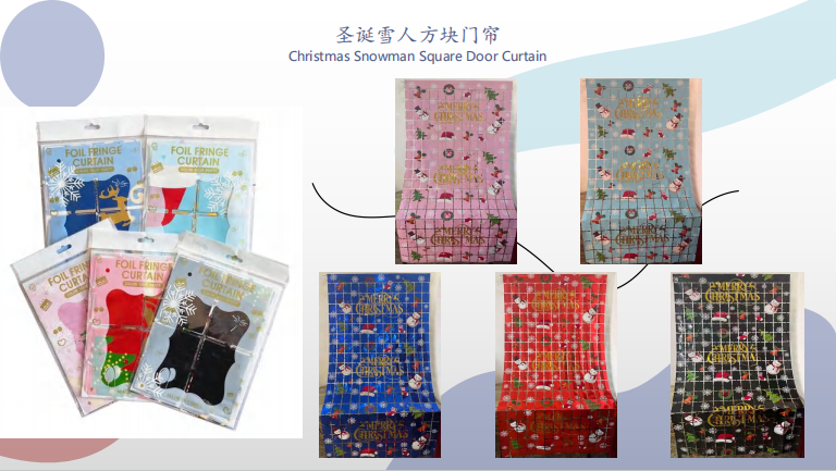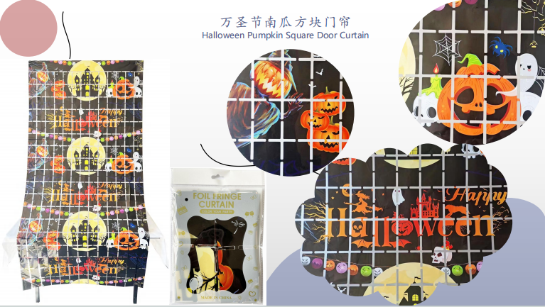 Seperti tirai foil hijau dan merah bertema Natal, tirai foil hitam dan oranye bertema Halloween, dan tirai foil dengan labu, kelelawar, laba-laba dan bentuk lainnya, yang dapat digunakan untuk dekorasi liburan di rumah, pusat perbelanjaan, bar, dan tempat lain.