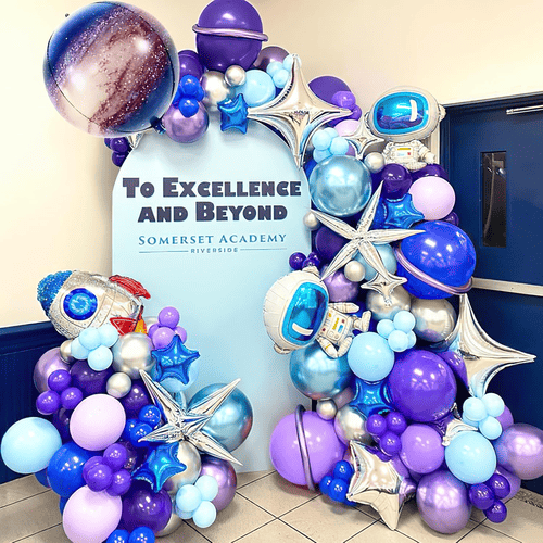 Karangan bunga balon tema galaksi hadir dengan kualitas tinggibalon lateksdan balon foil. Warna balonnya adalah ungu, merah muda, biru, dan sliver yang melambangkan galaksi. Paket ini sangat disukai banyak orang, termasuk pecinta astronomi dan pecinta luar angkasa. Oleh karena itu, ini dapat memberikan hasil penjualan yang sangat baik untuk bisnis Anda.