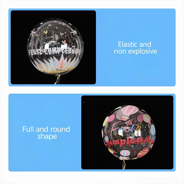 Balon Bobo Bobo Bobo yang dicetak memiliki kata -kata "Selamat Ulang Tahun" dan beberapa desain dicetak di permukaan balon. Cetakannya jelas dan cerah. Warnanya tidak memudar. Fitur utama dari desain adalah bentuk satu bagian. Kata -kata dan desainnya adalah bagian dari balon. Tampilannya lebih bagus dan lebih profesional. Tipe yang dicetak hadir dengan banyak warna dan banyak pola. Ini adalah bintang, mahkota, catatan, dan bentuk lainnya. Mereka menunjukkan kedalaman dan lapisan di permukaan balon yang jernih. Balon terlihat lebih kelas atas dan lebih elegan. Ini bagus untuk dekorasi pesta yang bagus.