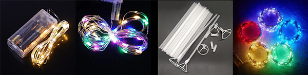Strip lampu LED, tabung plastik, cangkir balon, bulu |