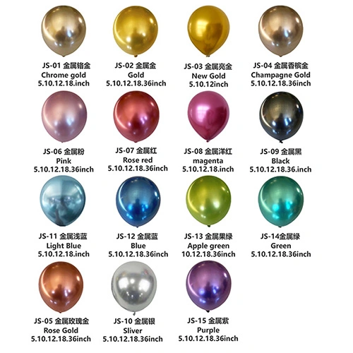 Balon metalik:Dengan lapisan cermin mengkilap serta tekstur dan warna yang menarik, ini adalah balon lateks paling serbaguna untuk digunakan dalam dekorasi pesta, pencetakan khusus, dan banyak lagi.