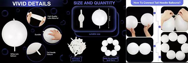 Baik itu pesta ulang tahun, pernikahan, perayaan atau acara lainnya, dengan memasangkan balon dengan warna yang sama atau warna lain, Anda dapat menciptakan suasana elegan yang Anda inginkan. Mereka akan menjadi hiasan yang sempurna untuk peringatan, Halloween, pesta selamat datang bayi, pesta Natal atau acara lainnya. Balon tautan adalah pilihan yang ideal untuk menciptakan suasana yang unik dan menarik perhatian.