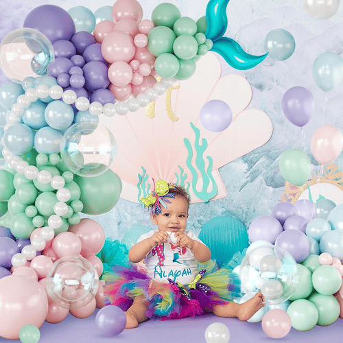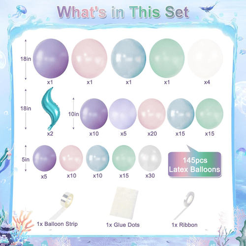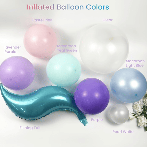 Balon dalam karangan bunga balon Putri Duyung hadir dalam berbagai warna, seperti ungu, lavender, merah muda pastel, biru muda, hijau teal, putih mutiara dan transparan, serta dekorasi ekor putri duyung foil, membuatnya cocok untuk menciptakan pesta bertema laut putri duyung yang ajaib.