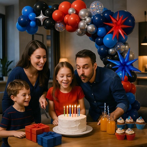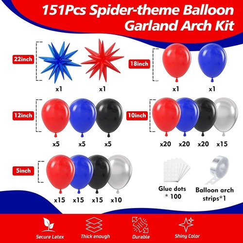 Warna utama set balon adalah biru, merah dan hitam. Ketiga warnanya yang khas akan membuat Anda membayangkan sosok keren Spider-Man dari film tersebut. Balon lateks dalam set ini antara lain balon merah matte, balon biru matte, balon hitam matte, balon sliver metalik. Balon foil pada set ini adalah balon foil bintang ledakan, warnanya biru dan merah.