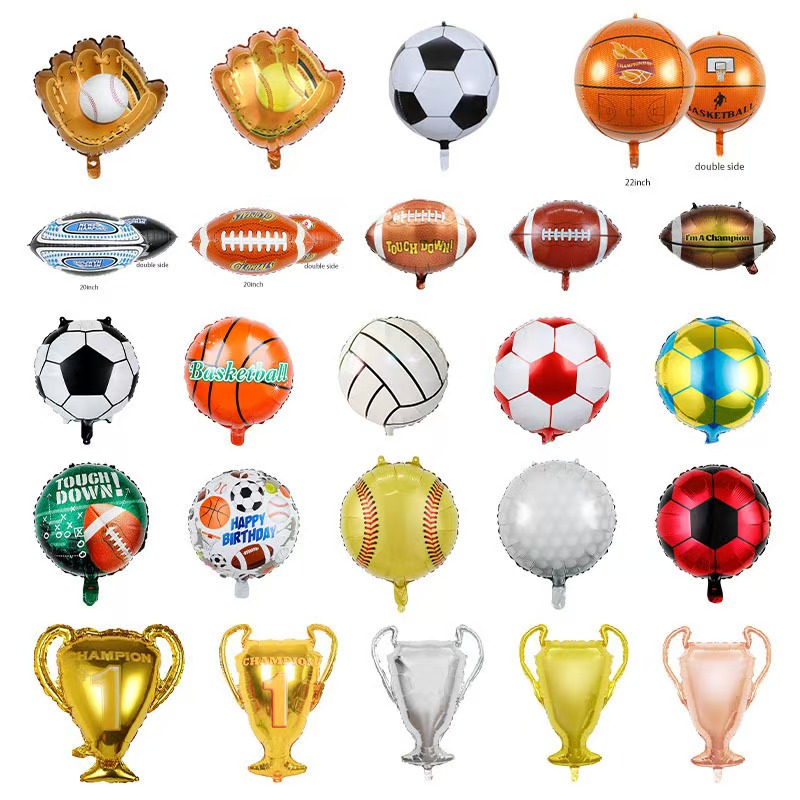 Setelan balon bertema olah raga dengan kompetisi yang dinamis, perebutan darah sebagai konsep inti desain, dengan warna-warna cerah, pola yang dinamis untuk menyampaikan gairah olahraga, sehingga aktivitas penuh dengan suasana semangat yang tinggi. Bola basket, sepak bola, tenis, dan tema olahraga individu lainnya atau adegan pesta olahraga yang komprehensif dapat didekorasi dengan balon untuk menciptakan pengalaman yang mendalam. Menurut karakteristik bahan dan skenario penggunaan, balon ini dibagi menjadi dua kategori: balon lateks bertema olahraga dan balon foil, yang cocok untuk berbagai skala aktivitas dan persyaratan tata letak.