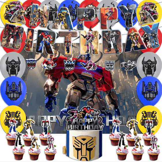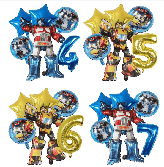 Kombinasi klasik: Balon foil transformator dengan bendera tema balon lateks warna, balon lateks sebagai alas, balon foil sebagai inti visual, bendera sebagai dekorasi tema, cocok untuk pesta ulang tahun, perayaan festival dengan tata letak dasar.