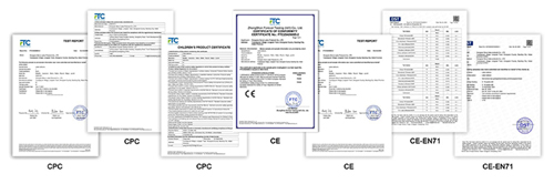 Rangkaian lengkap produk kami telah lulus sertifikasi CPC,CE,EN71 dan sertifikasi otoritatif lainnya, dengan kepatuhan ketat terhadap peraturan keselamatan pasar sasaran Eropa dan Amerika serta lainnya. Kualifikasi ini dapat membantu barang Anda melewati bea cukai dengan lancar dan sepenuhnya menghindari risiko kepatuhan di pasar luar negeri.