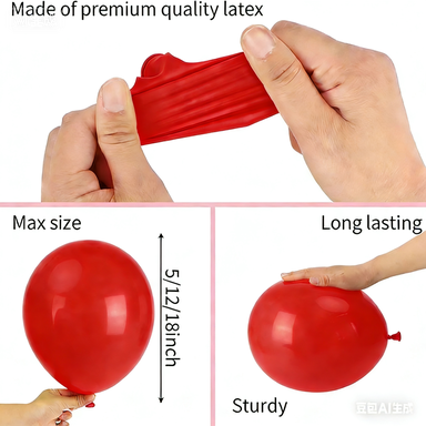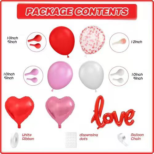 Kit balon ini sebagian besar terdiri daribalon lateksdan beberapabalon foil. Balon lateksnya berwarna merah, pink, putih. Mereka terbuat dari 100% lateks alami, yang benar-benar ramah lingkungan dan tidak berbahaya bagi tubuh manusia. Dan ukurannya juga bermacam-macam. Untuk menghasilkan lapisan yang indah, ukuran balon lateks mulai dari 5 inci hingga 12 inci. Menyusunnya dalam satu set sangat mudah, kami juga menyiapkan lem titik dan rantai balon dengannya. Jadi sambil mengaturnya, Anda bisa melakukannya dengan fleksibel.